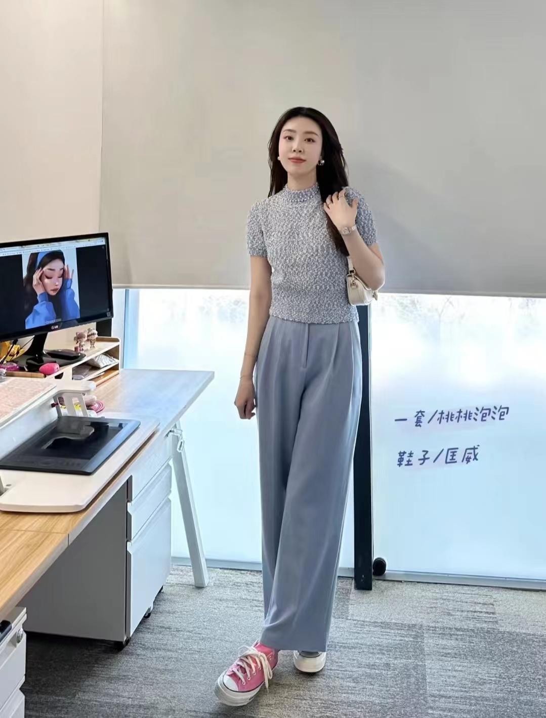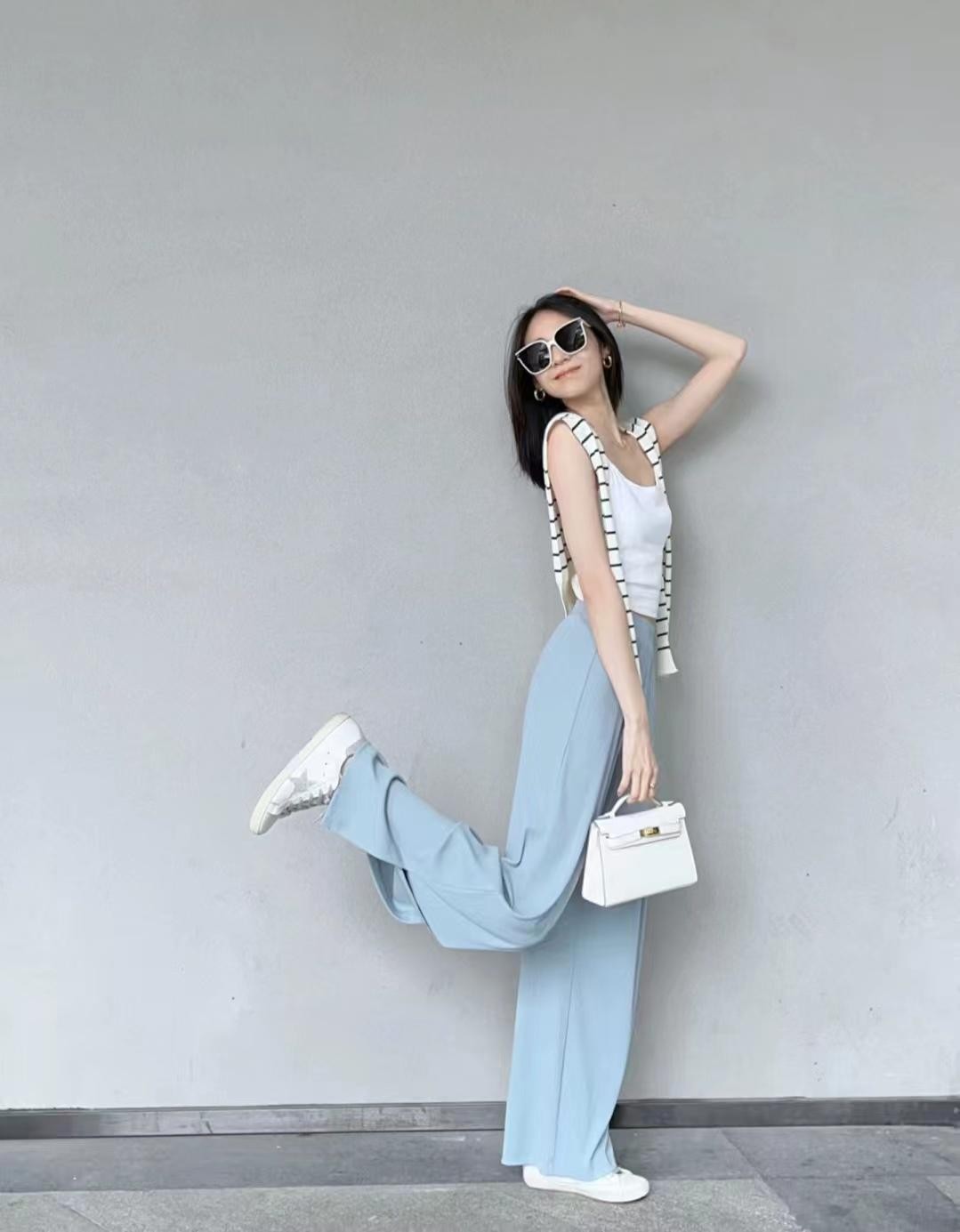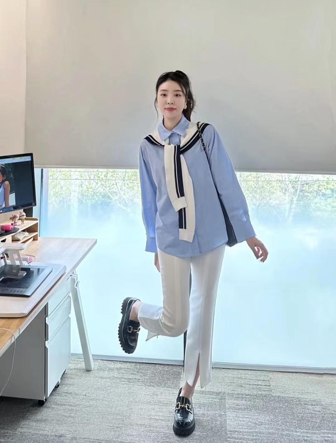 清爽蓝衬衫:自带披肩时髦感upup,搭配白色西装裤超清爽,衬衫在夏天也可以做防晒穿非常实用。