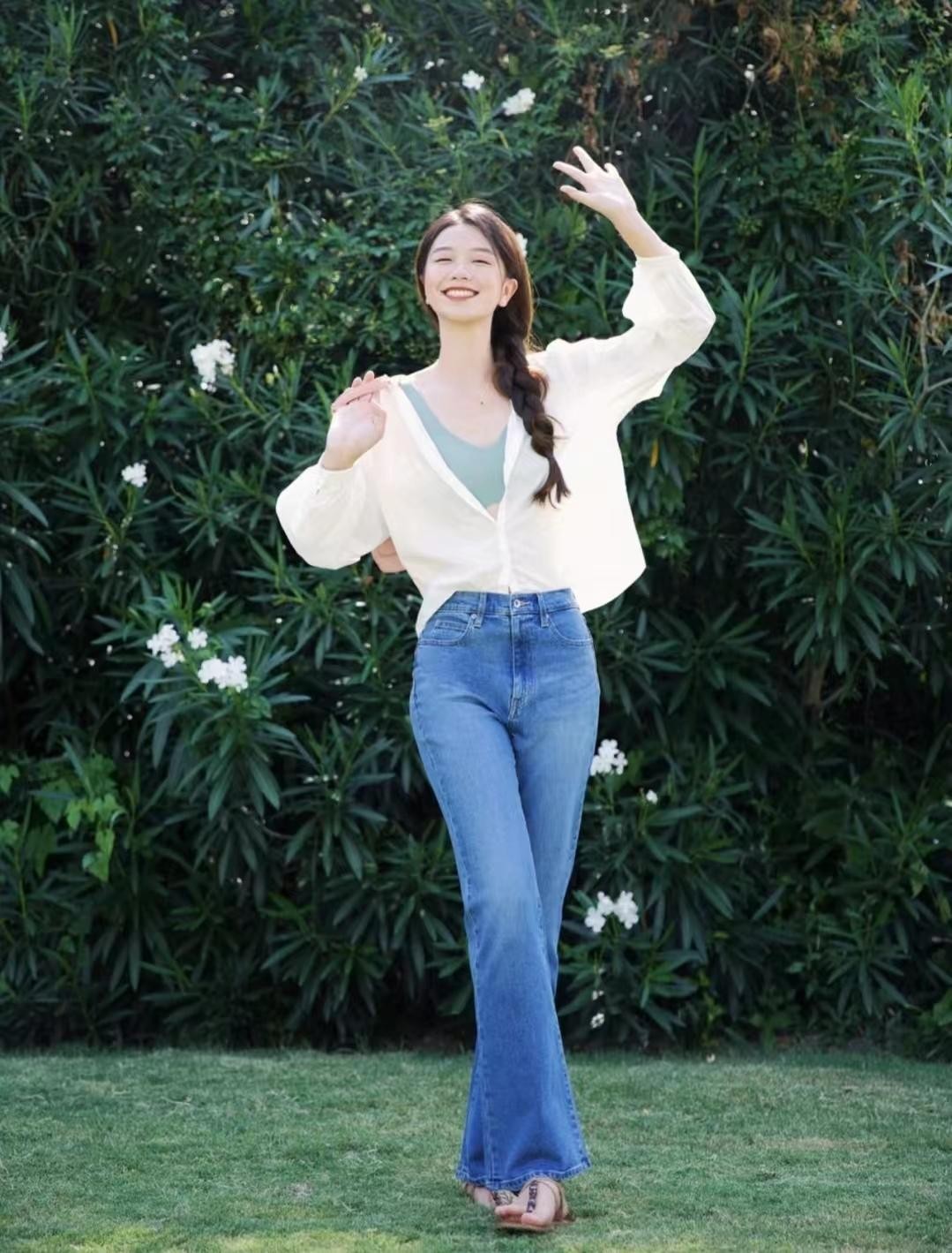 白色的法式衬衫搭配微喇牛仔裤,一眼就视觉降温了哈,搭配个清新色系的远山绿轻氧Bra,轻松显身材又日常舒适!