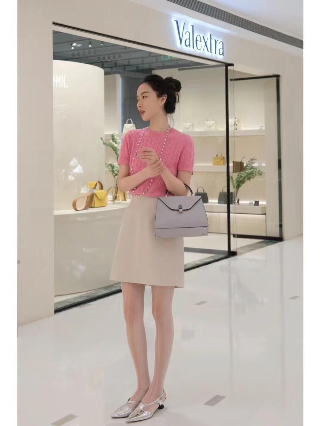 短针织与短裙组合,凉爽的同时显高又显瘦,上衣做了绞花肌理,不会觉得单调,下身白色A字裙,挺括有型,宽胯、臀腿肉肉统统遮住,配色上也是清新甜美的粉白组合,整套look既温柔又充满少女感。