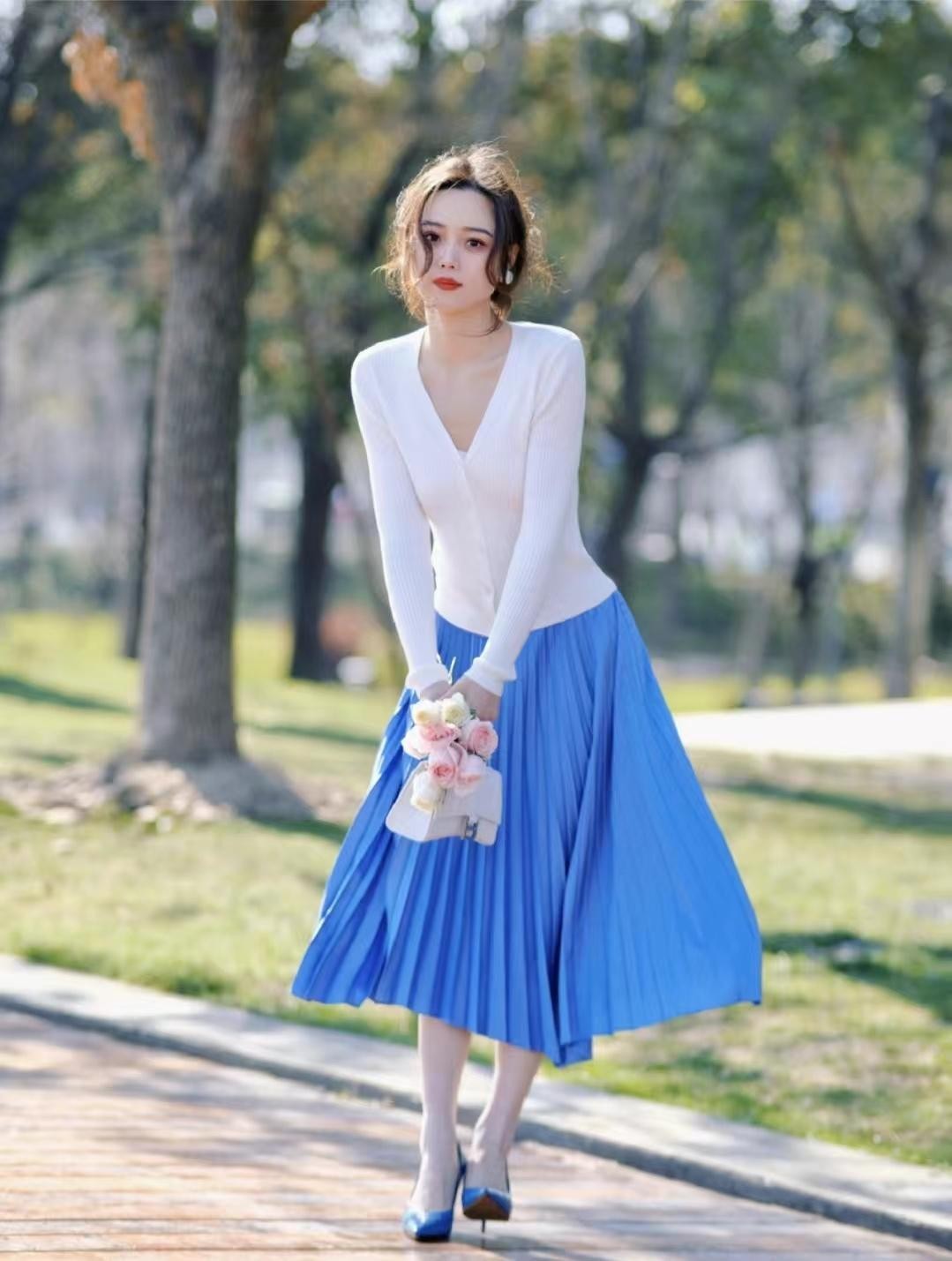 优雅淑女风:白色针织衫+缎面小蓝裙,柔软的白色V领针织和超吸睛的光泽感蓝色半裙,碰撞出不一样的感觉,不对称的裙摆设计是最近的秀场大热,行走间波光粼粼,摇曳生姿,舒适又女人味!