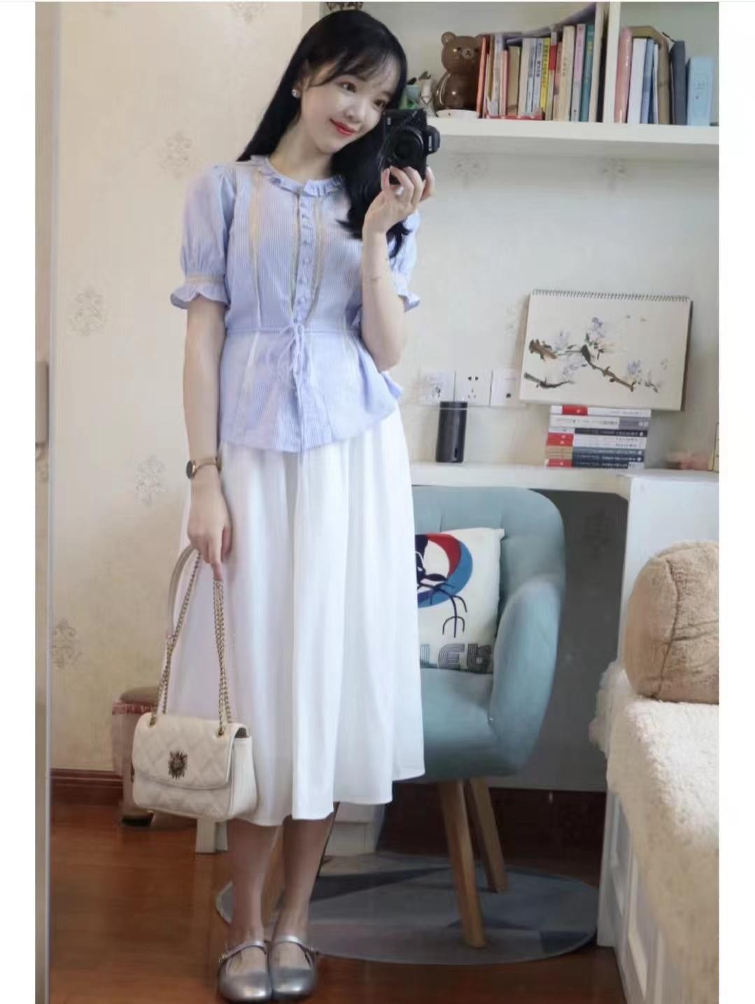 这件蓝色衬衫它的颜色清新明亮,让人一眼就爱上了它。设计也很时尚,领口有一点小花边,腰间系带很有层次感,还有蓝色的纽扣,非常精致,搭配白色半裙,整体简约高级,非常适合日常穿着。