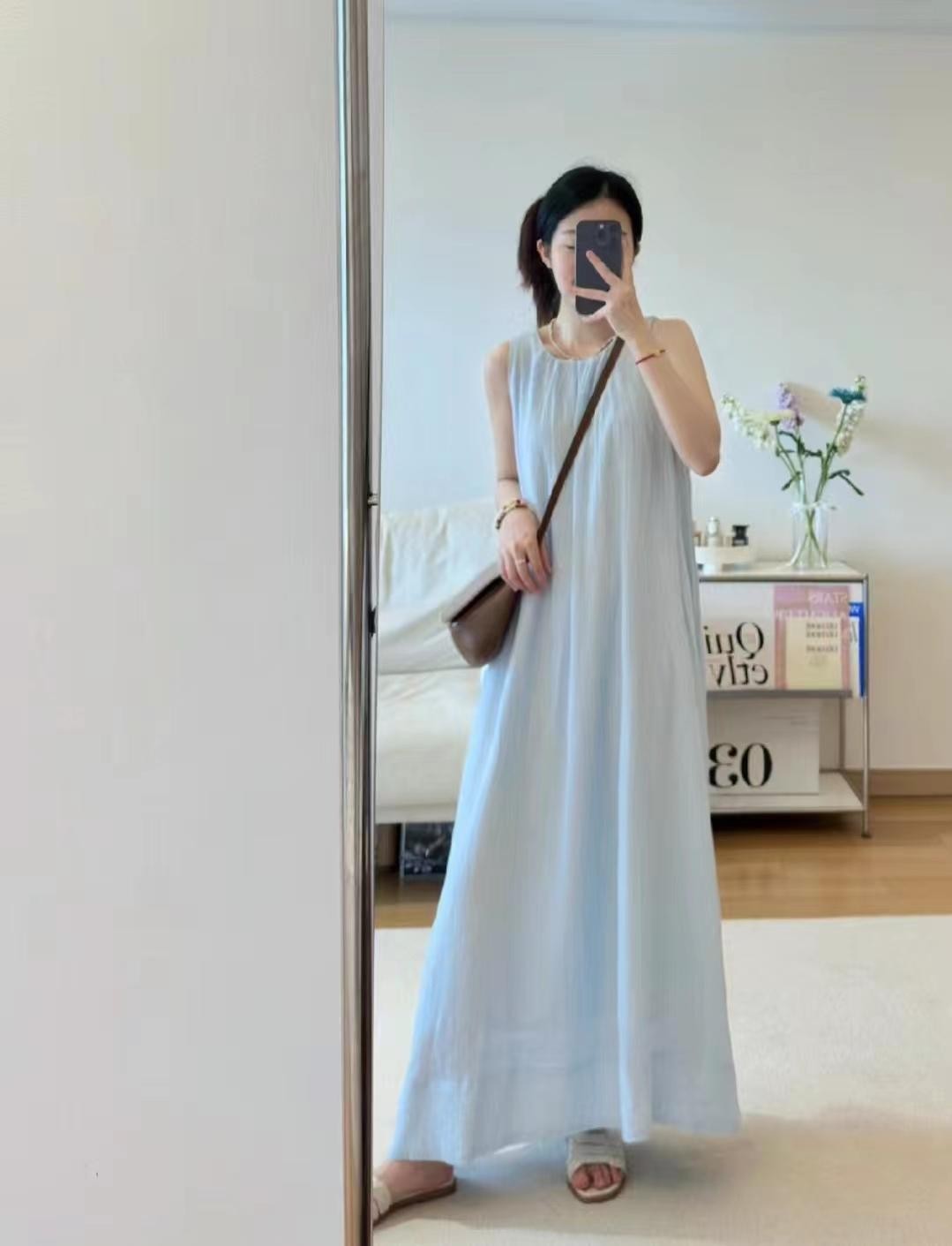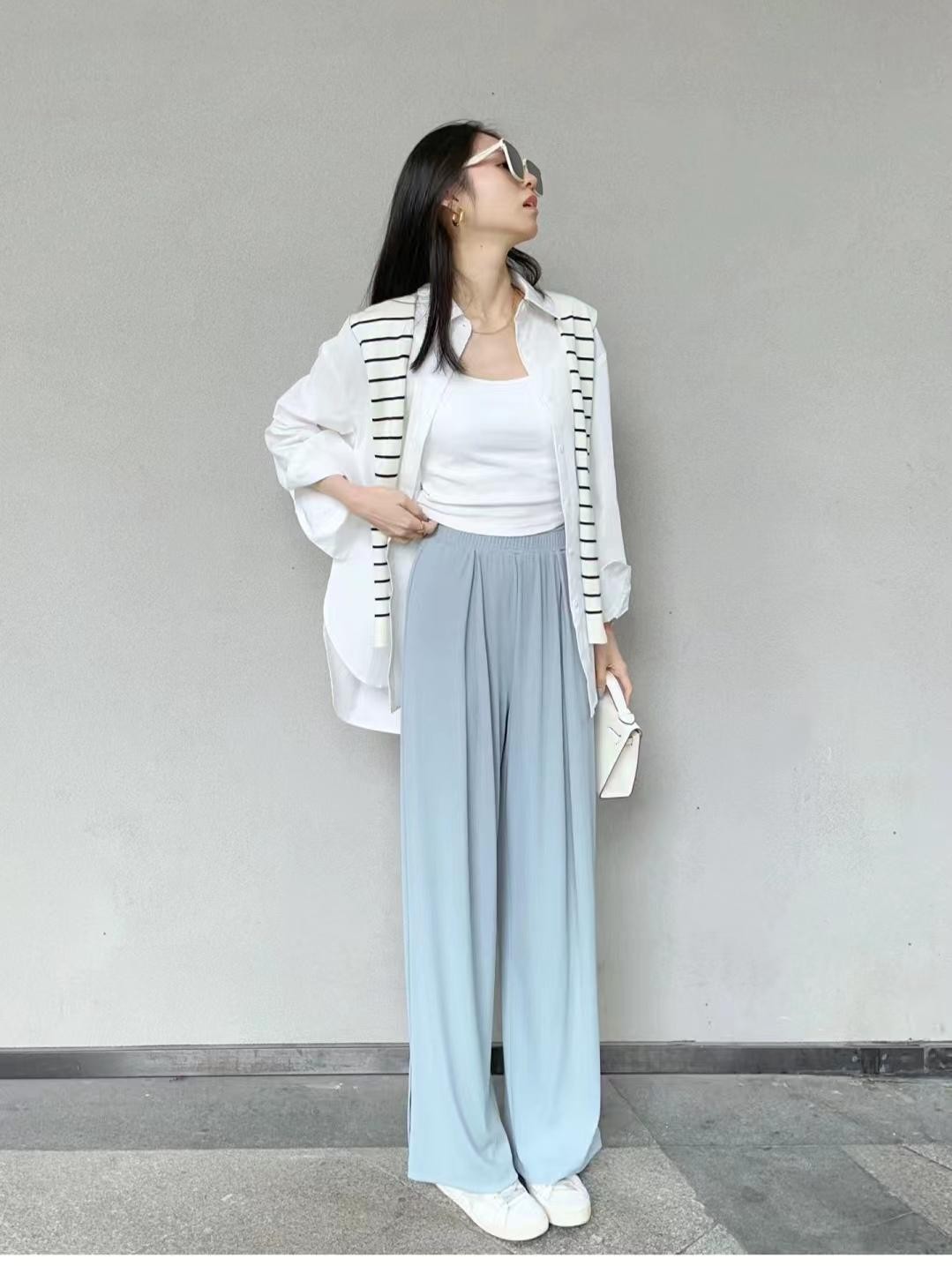 白T+蓝简单清爽:白上衣和阔腿裤的搭配多了些松弛感,比起短裤更偏好穿防晒裤,云朵原纱面料的简直是夏日救星,冰冰凉凉的透气隔热。