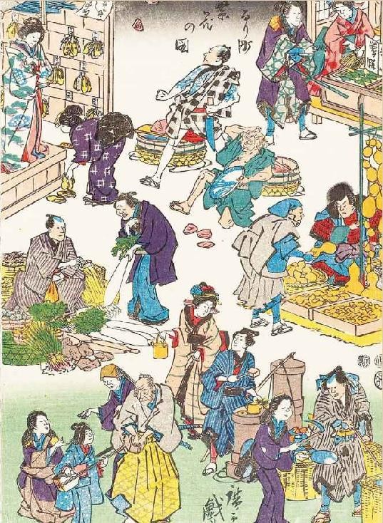 这就是“引车卖浆”这个成语的由来,犹如说“引车而入卖浆之家”,绝不是指拉大车的和卖豆浆的两种职业,而是由信陵君的故事引申而来的泛指。《净琉璃町繁荣之图》系列共七个场景,描绘了日本江户时代浅草寺一带繁华的商业活动。这个系列在广重的作品中不算十分有名,不过充分展现了绘者冷静细致的观察力,即便描绘市肆繁荣也带有广重特有的静谧色调。这一幅中,人群熙攘,百货杂陈,有小贩与客人笑语似讨价还价,有路人似被空中坠物砸到,有弹着三味线的垂髫少女,其余打酒、送茶、买蔬菜、试木屐,细节纷呈,似一出无声电影。