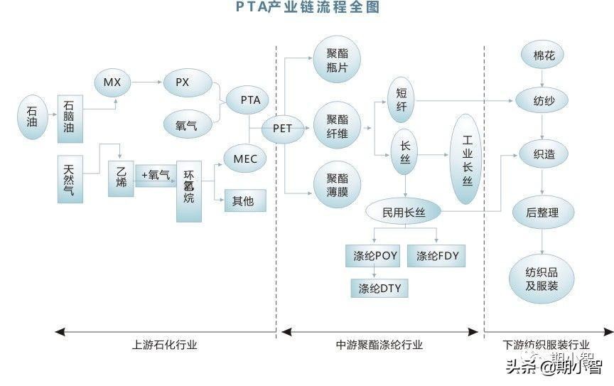 PTA是石油的末端产品,其原料是对二甲苯(简称PX),而PX的原料是石油。PTA是化纤的前端产品,其下游产品主要为涤纶长丝、短纤、切片(包括纤维切片、瓶用切片、薄膜切片)。