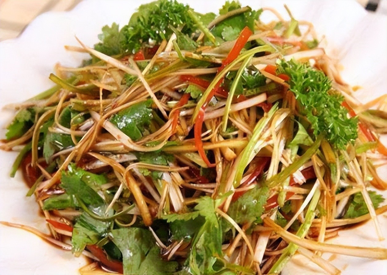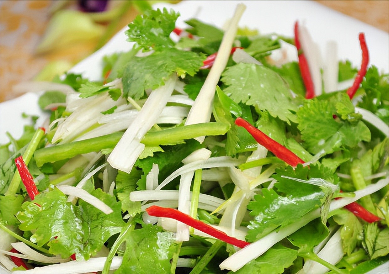 准备大葱一根,切成细丝青红尖椒一根个切成细丝,再准备香菜一小把去根后洗净切成细丝,把这三种丝放一块放上一勺生抽,半勺陈醋,一勺香油,一勺盐,再来点鸡精味精,辣椒油,拌匀后就可以吃了,开胃解腻又下饭,非常美味,赶紧做起来吧。