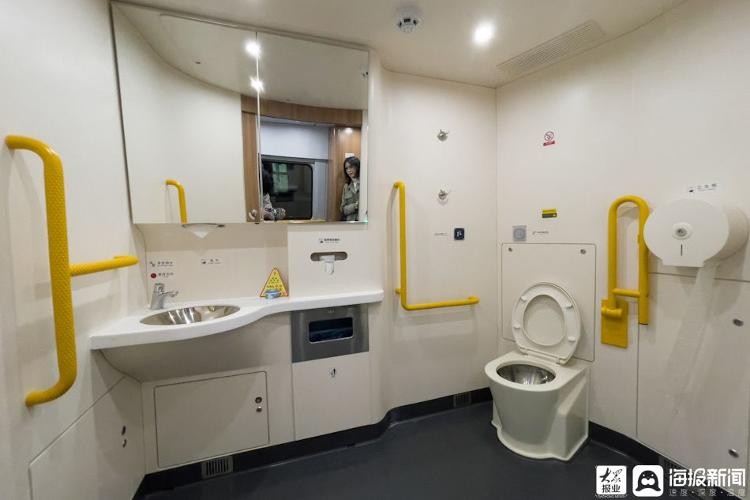 图:列车设有无障碍卫生间及轮椅存放区,并在座椅、卫生间提供一键呼叫应急服务。