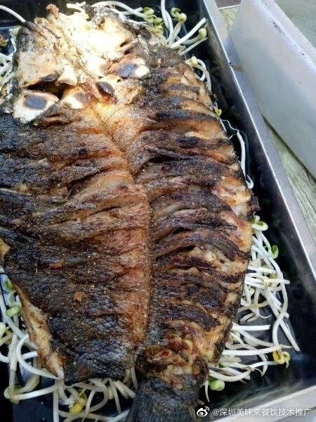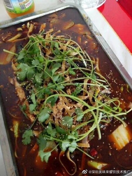 4.将炒好的料汁浇在鱼上,撒上葱花,香菜,花生碎,放在专门的炭火盘上,边吃边烤,吃完还可加其他配菜。