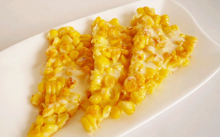 4、锅中放半碗油烧热后,倒出,转小火,此时锅中留一点点油,把玉米粒倒入,可用手背轻轻把玉米粒摊平。接着用小火煎三到五分钟左右,让玉米粒都粘连在一起成整块饼。
