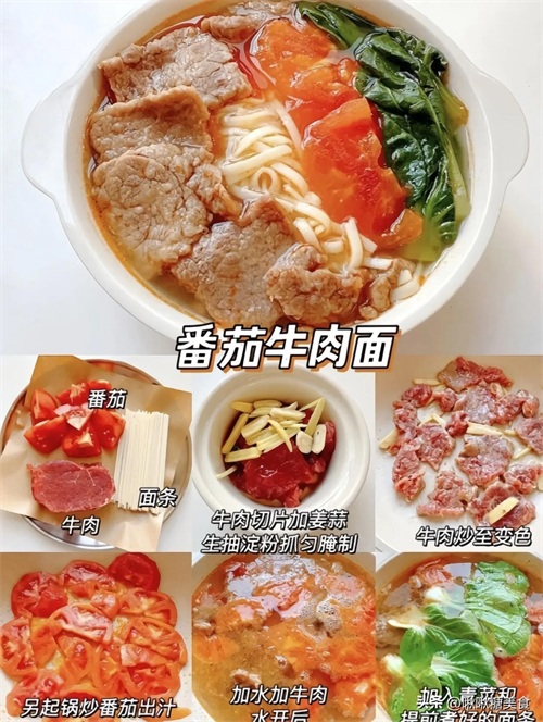 番茄牛肉面食材:牛肉、鲜番茄、面条、葱、姜、蒜、盐、糖、油做法: (1)将牛肉切成小块,鲜番茄切成小块备用。 (2)将姜和蒜切碎炒香,加入牛肉块翻炒至熟。 (3)加入鲜番茄块、盐和糖煮熟。 (4)将面条焯水之后控干水份放入碗中。将牛肉和番茄酱倒入旁边,最后加入适量的盐、油和热水搅拌均匀即可。