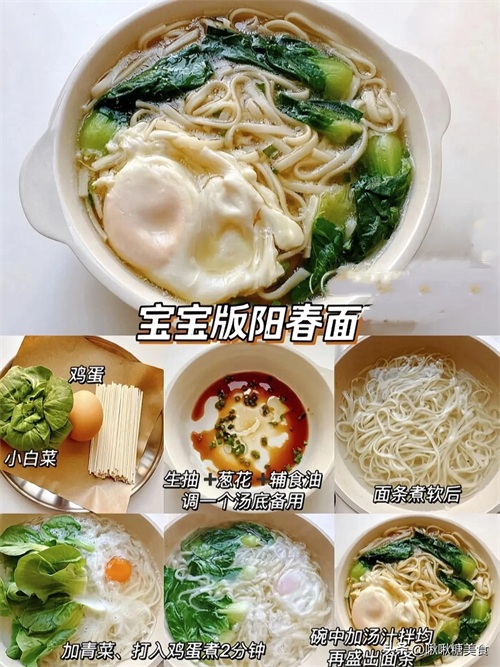 宝宝版阳春面食材:鸡蛋、面条、葱、盐、小白菜油做法: (1)葱花,辅食油,生抽调一个汤底备用。 (2)将面条煮软之后加鸡蛋和小白煮熟后倒入面碗中,加入适量的盐和油,最后加入热水搅拌均匀即可。