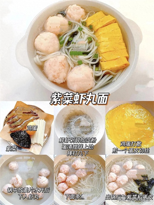 紫菜虾丸面食材:紫菜、虾、面条、鸡蛋,姜、葱、盐、油做法: (1)将虾剁碎加淀粉加蛋清搅拌上劲备用。 (2)鸡蛋打散剪一个蛋皮 (3)锅中放姜片煮开下入虾丸,然后下面条,出锅加紫菜。
