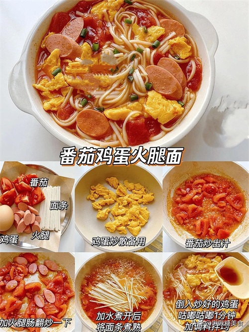 番茄鸡蛋火腿面食材:鸡蛋、火腿肠、鲜番茄、面条、葱、姜、盐、油做法: (1)将鲜番茄和火腿肠切成小块,翻炒一下 ,鸡蛋炒散备用(2)加水和面条煮熟(3)将鸡蛋打散加入葱姜炒熟,加入鲜番茄和火腿肠翻炒,最后加入盐煮熟。 (4)将炒好的鸡蛋、倒入面碗中,加入适量的油和盐,最后加入热水搅拌均匀即可。