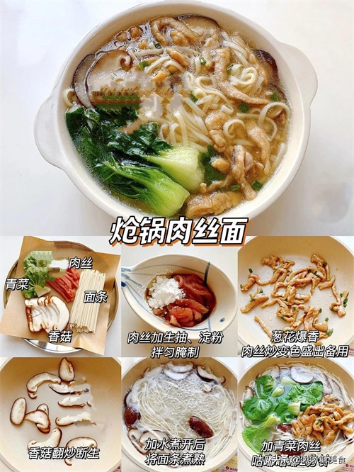 炝锅肉丝面食材:猪肉、香菇,大葱、面条、酱油、盐、油做法: (1)将猪肉切成小丝,加入酱油和葱姜备用。 (2)将炒锅加热,放入油和葱姜煸炒出香味后倒入猪肉丝,翻炒至熟。 (3)香菇翻炒和面条一起煮熟,(4)将炒好的猪肉丝放在面碗中,加入适量的盐和油,最后加入热水搅拌均匀即可。、姜和葱切碎放入面碗中,最后加入适量的盐和热水搅拌均匀即可。