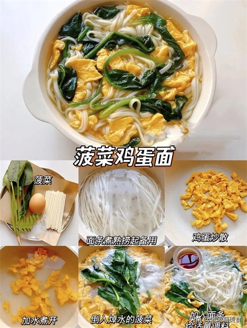 菠菜鸡蛋面食材:鸡蛋、菠菜叶、面条、葱、姜、盐、油做法: (1)将菠菜叶、鸡蛋煮熟备用。 (2)将面条焯水之后控干水份,放入碗中。 (3)将煮好的菠菜叶切碎和鸡蛋切成小块,加入葱姜炒熟备用。 (4)将炒好的菠菜叶和鸡蛋块切成小粒倒入面碗中,加入适量的盐和油,最后加入热水搅拌均匀即可。