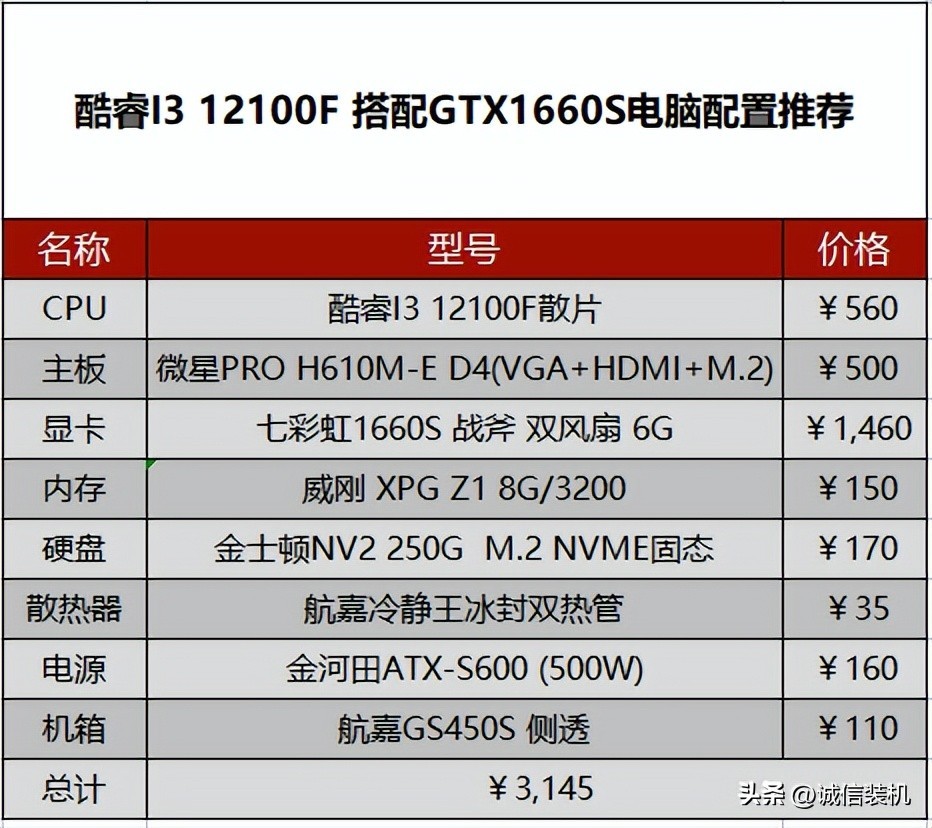 4:酷睿I3 12100F 搭配GTX1660S电脑配置推荐清单及价格