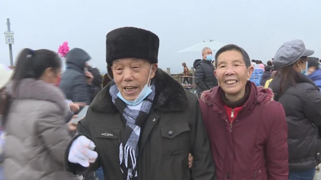 今年87岁的胡冬云带着74岁的妻子陶绍美也来到泸山,他们说两年多没上泸山了,今天下雪来看一下,没想到山上这么美,这么热闹。