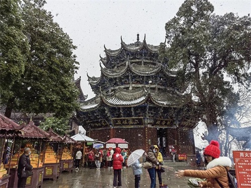 泸山又名蛙山,与邛海构成川西南一大景区,被誉为"川南胜境",儒教、道教、佛教三教同在一山中,在全国绝无仅有。清幽古刹掩映在皑皑白雪中,给新年带来了新的气象。