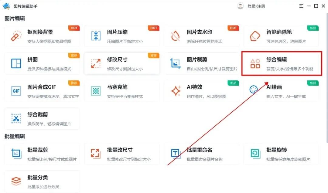 打开软件,进入首页后点击选择【综合编辑】功能,导入图片文件即可;