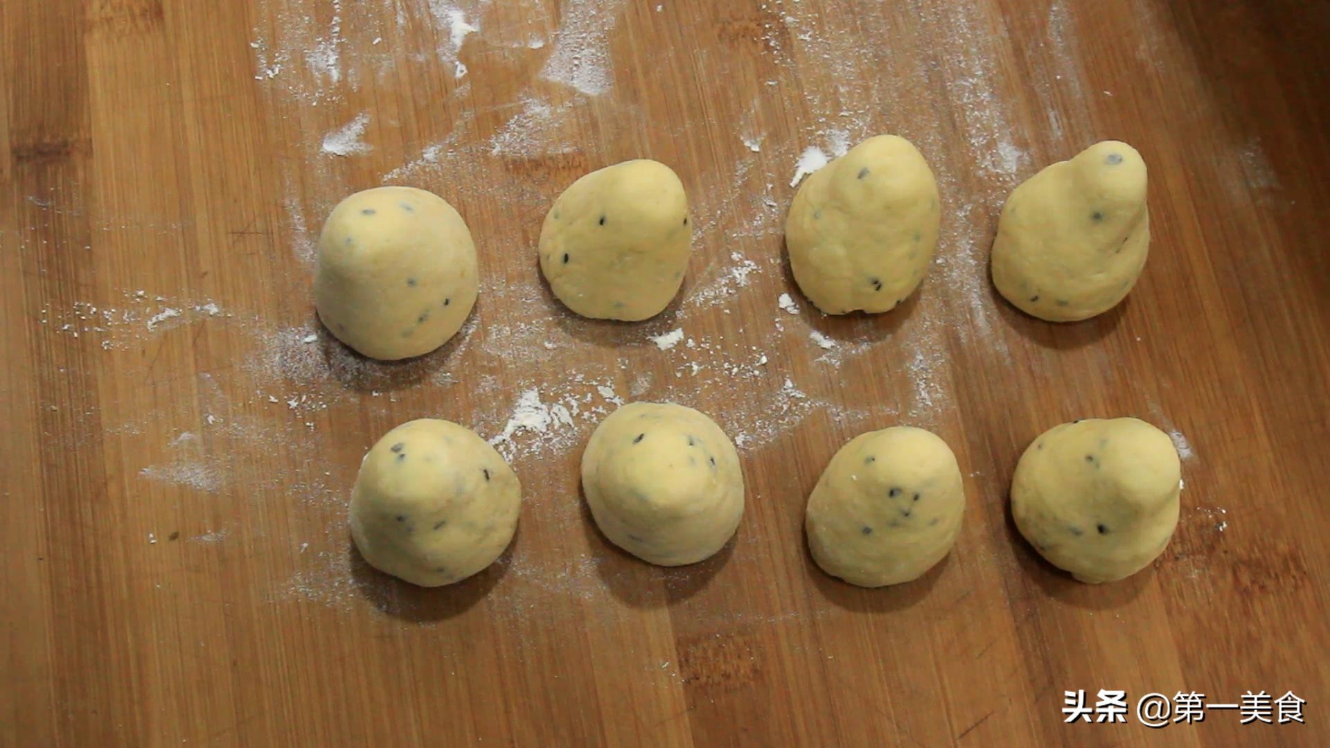 2.1个小时以后,我们在案板上撒上底面,把面团取出多揉一会,排除里面的空气,然后把面团搓成长条下8到10个面剂子。