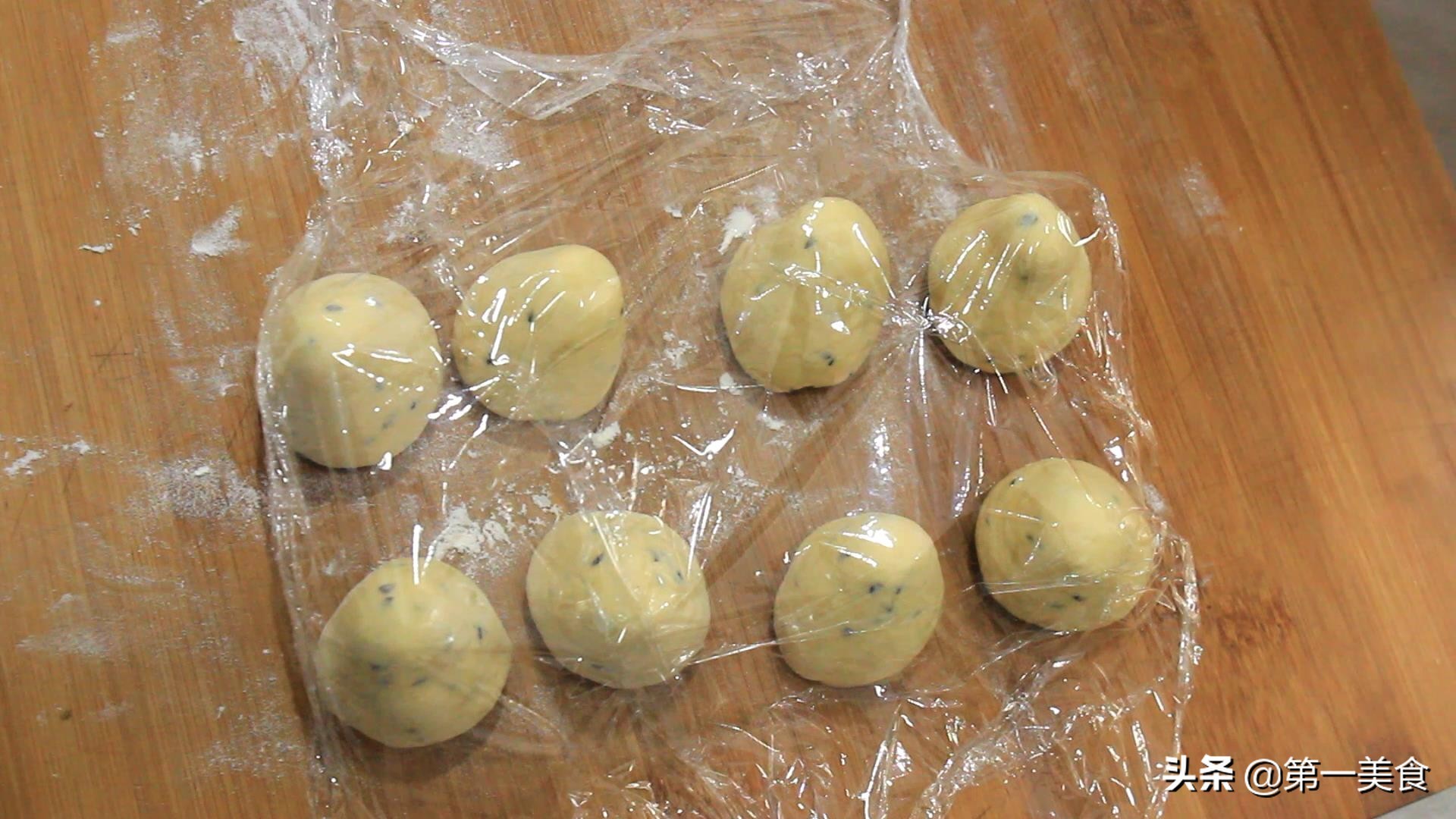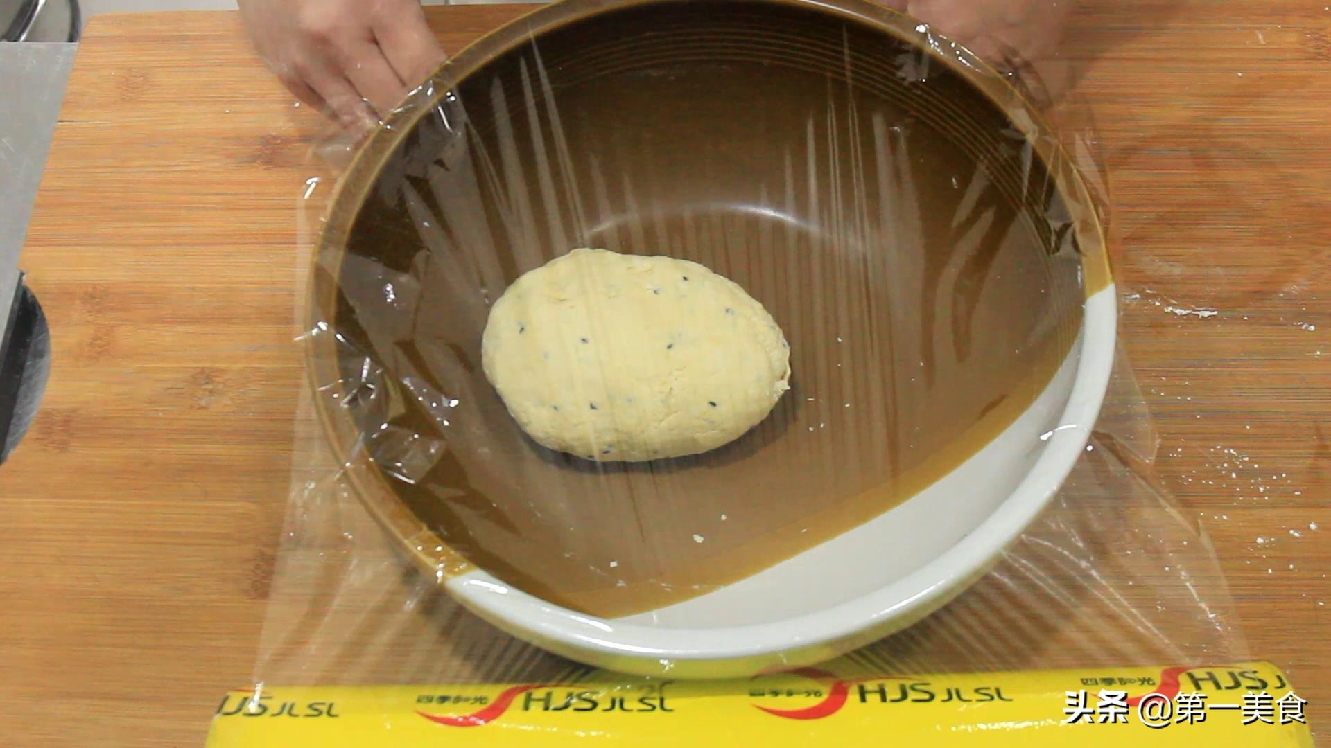 搅拌至没有干面粉,下手揉成光滑的面团,用保鲜膜盖住,密封发酵至原来的两倍大,现在温度比较高,大概一个小时就可以了。