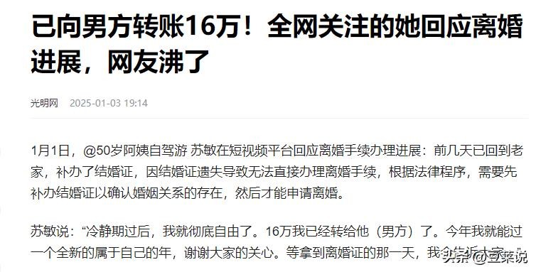 信息来源:光明网2025.1.3——已向男方转账16万!全网关注的她回应离婚进展,网友沸了