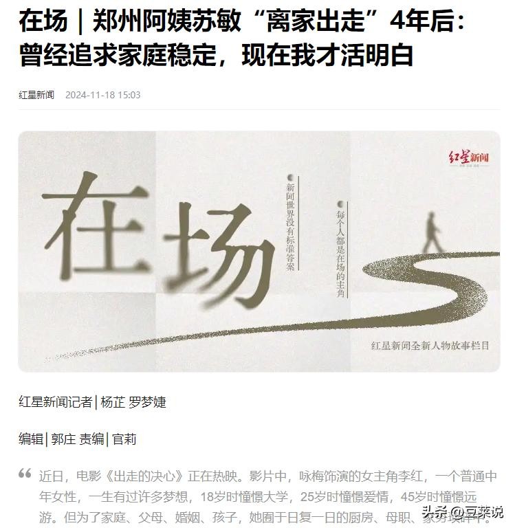 信息来源:红星新闻2024.11.18——郑州阿姨苏敏“离家出走”4年后:曾经追求家庭稳定,现在我才活明白