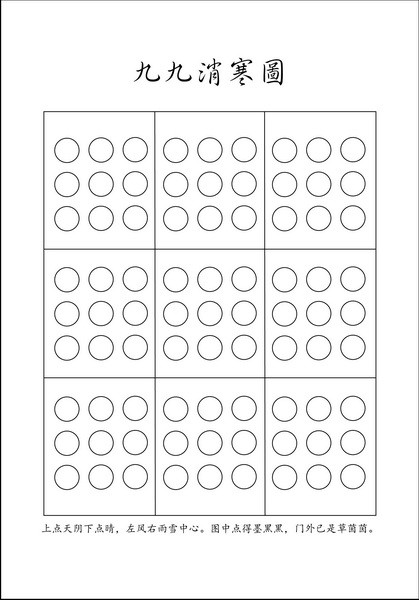 又有,《帝京景物略》卷二述:“有直作圈九丛,丛九圈者,刻而市之,附以九九之歌,述其寒燠(yù,暖热之意)之候。”即一纸卷上印八十一个圆圈、注明日期,每天用朱红色染一圆,染尽就出九了。