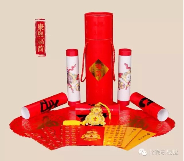 2016福筒(包含:皇帝“御制”对联、横批、福字一套、皇帝书写福字字样贴一对,金瓜将军门神一对、福喜盈积和永受嘉福红包两套,大吉挂饰一个,大吉贺卡一套。注:三款随机发放。)