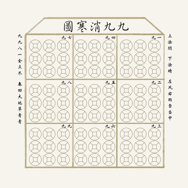 古代因数九而产生一种《九九消寒图》,亦是辞冬迎春之意。既可计算时间、做日历、物候历,又是优美的装饰画,故而流传不衰,不论宫廷民间都采用作冬日的文娱活动。