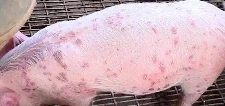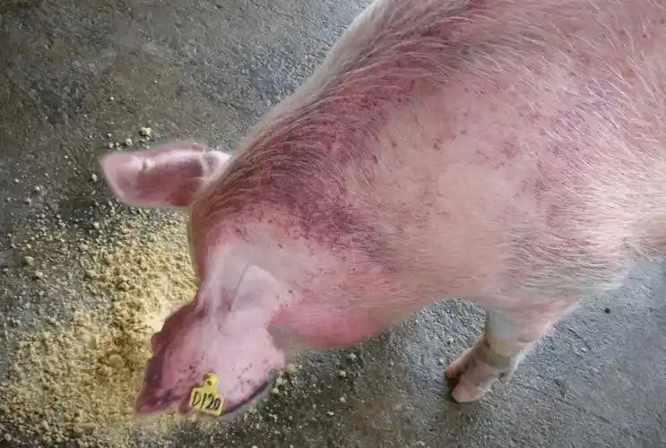 • 育肥猪:急性型病例少见。亚急性型病猪耳朵、颈下等部位皮肤红紫,部分病畜可见耳廓、尾、四肢末端坏死。慢性型患猪尿呈黄色,大便干如栗状,表面带有黑褐色或鲜红色的血液,生长缓慢,出栏延迟。
