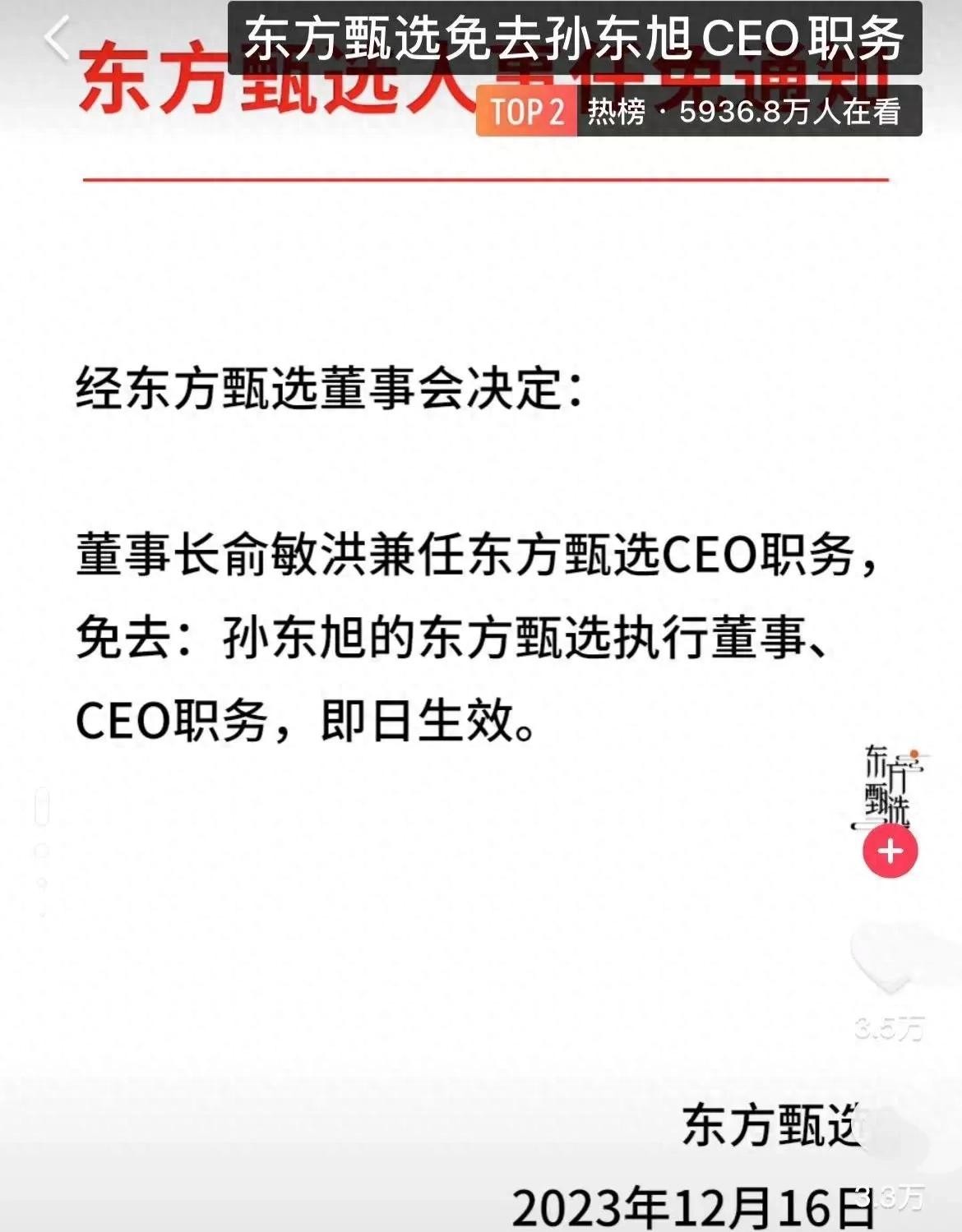 12月16日,东方甄选发布公告,宣布免去孙旭东CEO职务,可以说,这段时间不断升级的“小作文事件”风波,终于有了结果。
