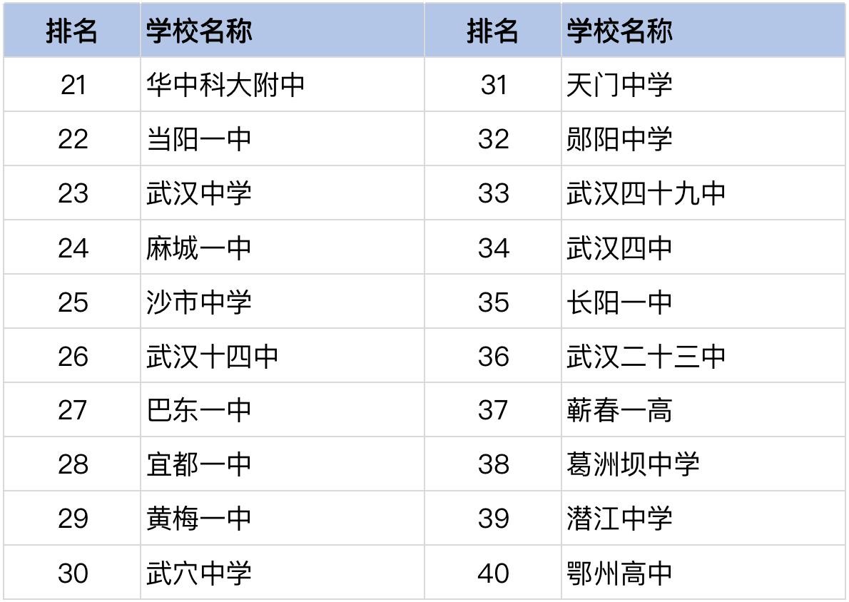 荆州市排名最高的学校无悬念是荆州中学,位居第16位。前二十位除了武汉的一些优质高中,还有恩施高中、黄石二中、龙泉中学、孝感高中入选。