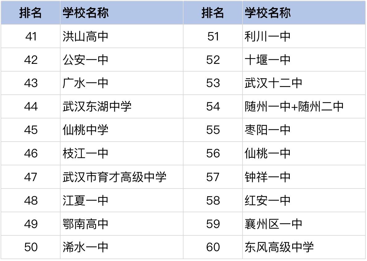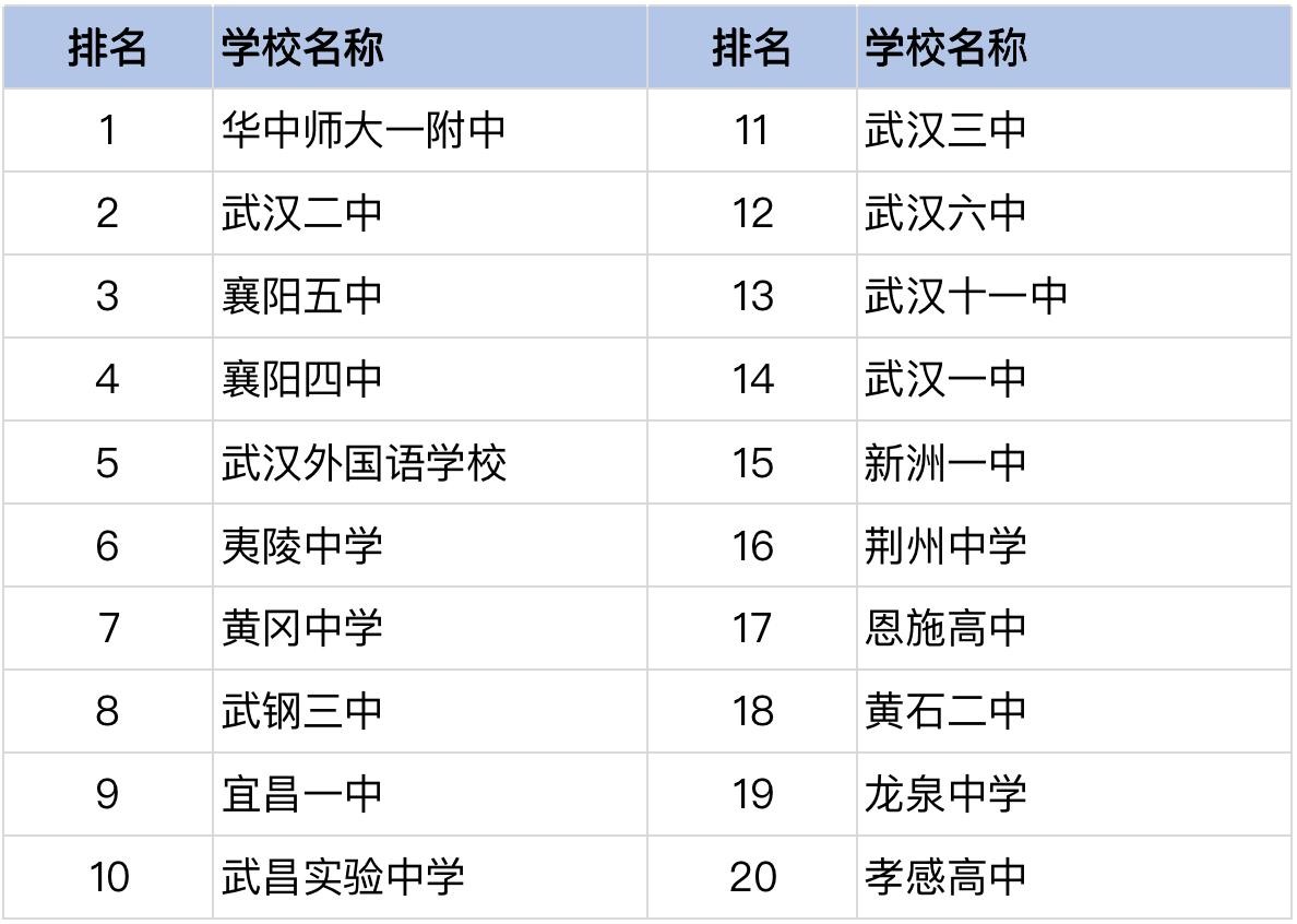 位居榜单前十位的学校是:华师一附中,武汉二中,襄阳五中,襄阳四中,武汉外国语学校,夷陵中学,黄冈中学,武钢三中,宜昌一中,武昌实验中学。