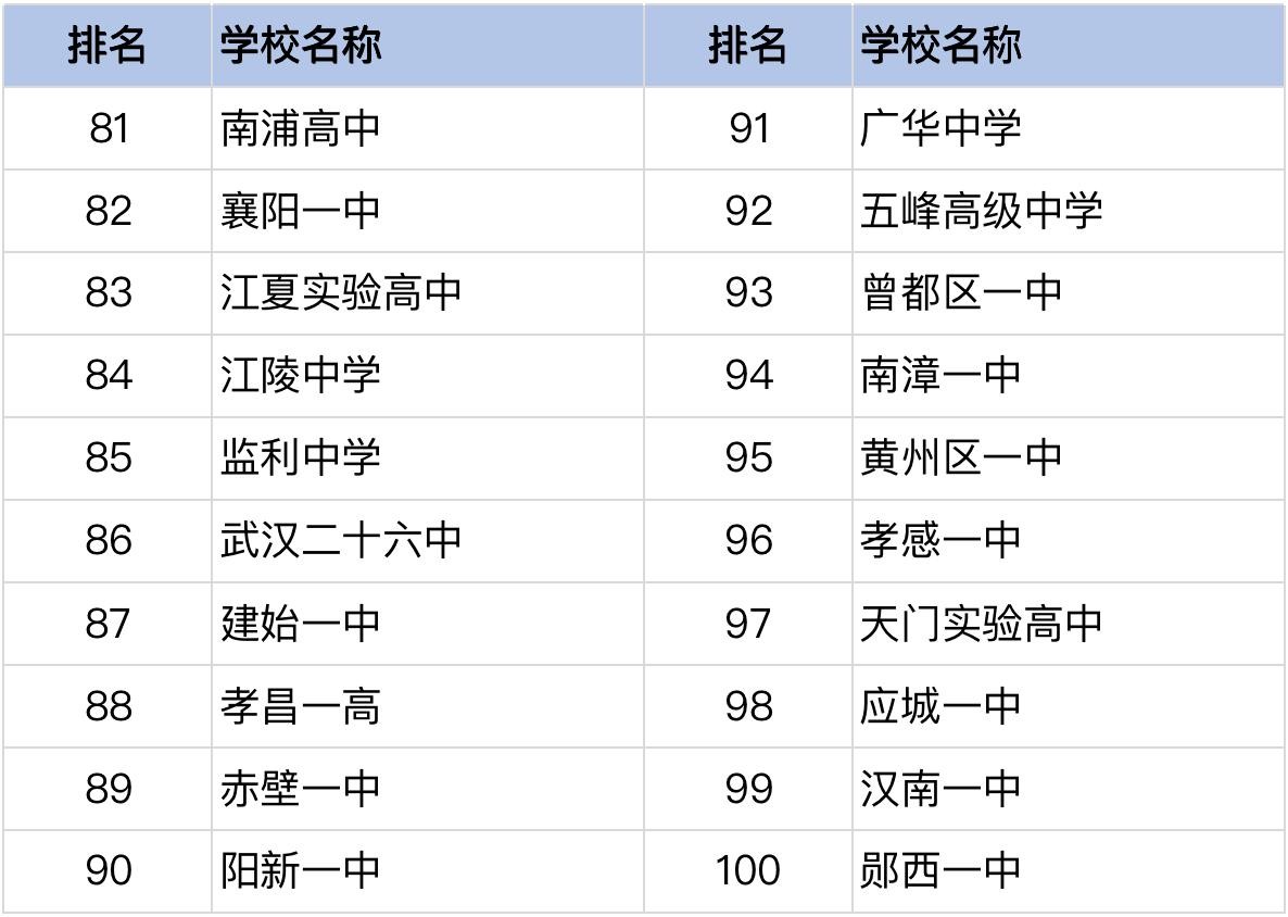 排名第81-100位荆州市的高中有江陵中学,位居第84位;监利中学,位居第85位。
