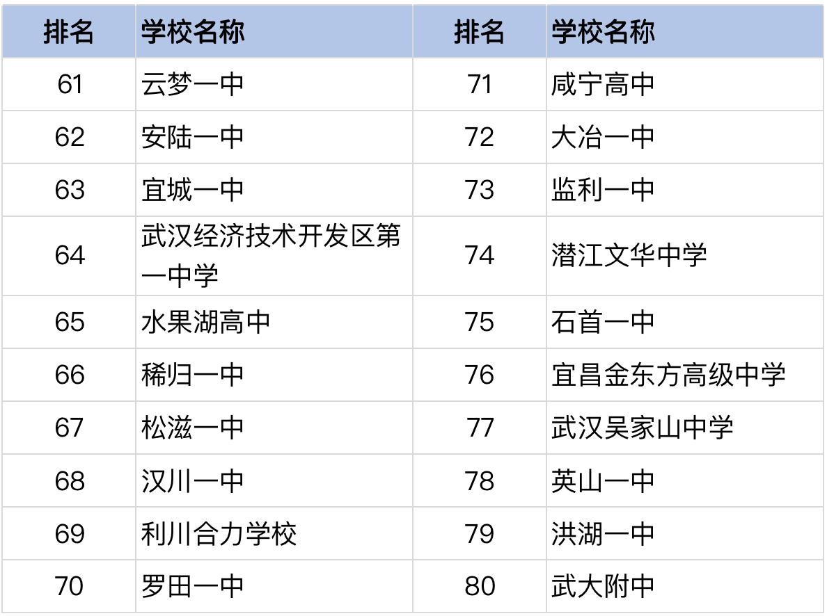 排名第61-80位荆州市的高中有松滋一中,位居第67位;监利一中,位居第73位;石首一中,位居第75位;洪湖一中,位居第79位。