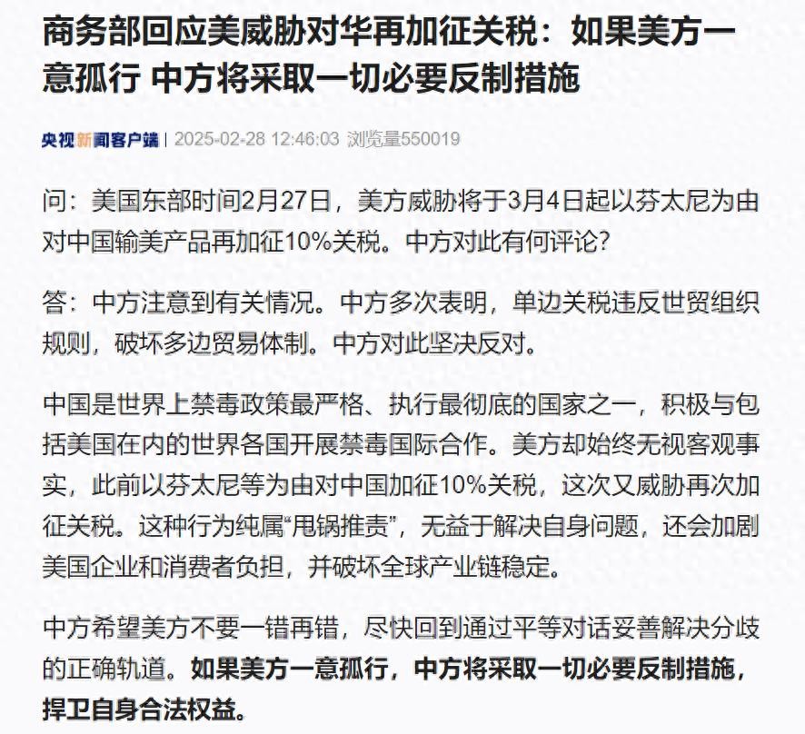 问:美国东部时间2月27日,美方威胁将于3月4日起以芬太尼为由对中国输美产品再加征10%关税。中方对此有何评论?