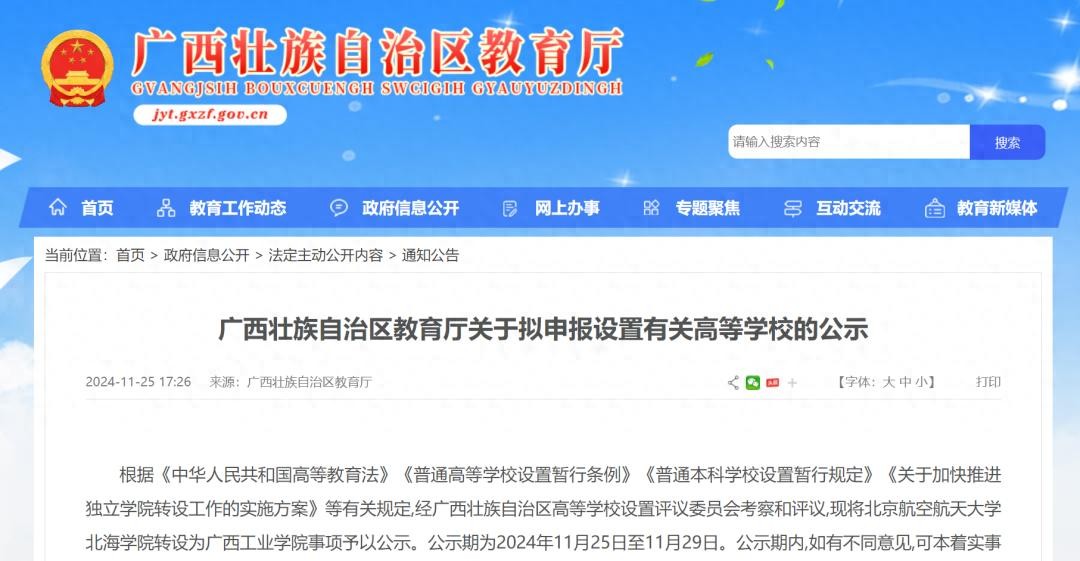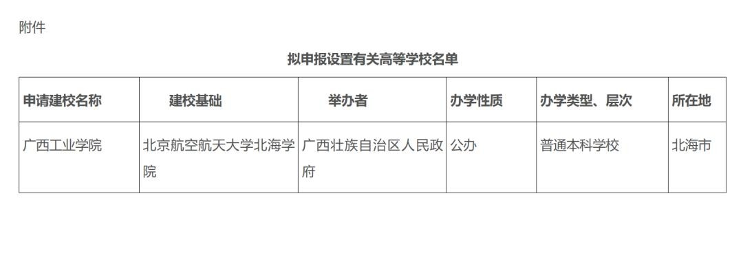 新京报讯 据广西壮族自治区教育厅消息,近日,《广西壮族自治区教育厅关于拟申报设置有关高等学校的公示》发布,北京航空航天大学北海学院将转设为广西工业学院,事项正在公示。