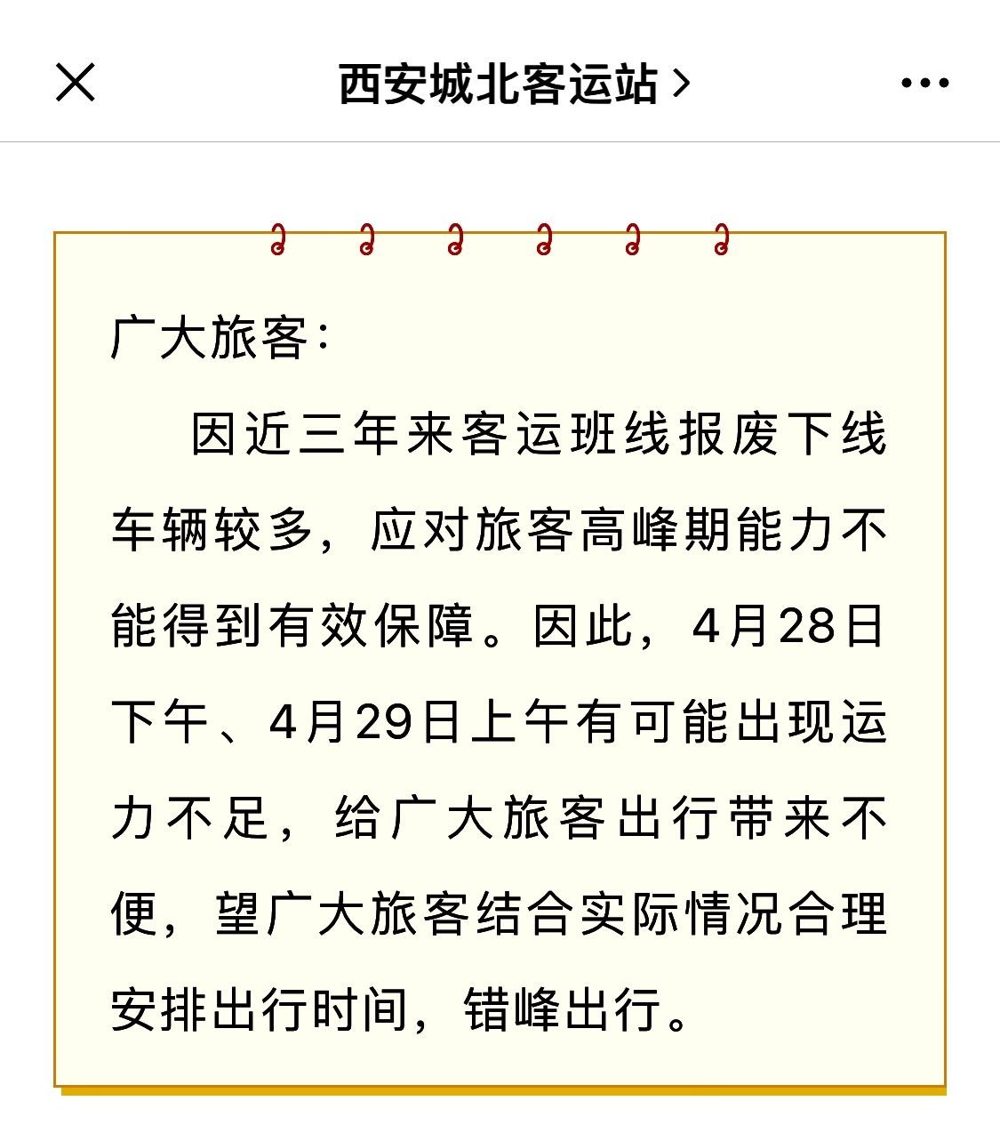 西安城北客运站提醒:4月28日下午、4月29日上午可能出现运力不足