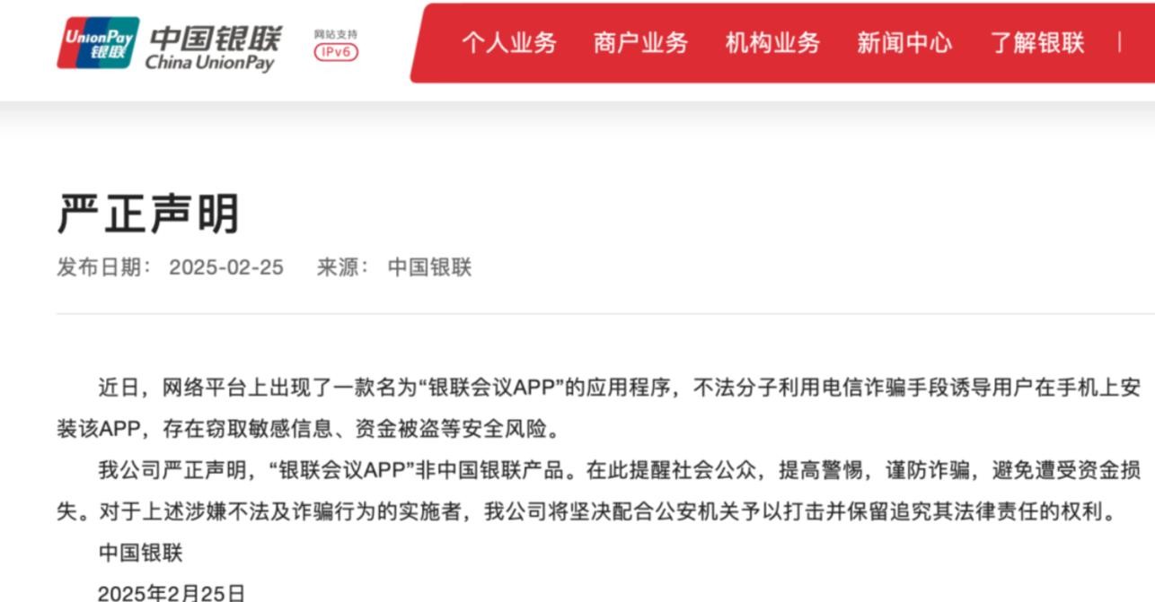 2月25日,中国银联称,近日,网络平台上出现了一款名为“银联会议APP”的应用程序,不法分子利用电信诈骗手段诱导用户在手机上安装该APP,存在窃取敏感信息、资金被盗等安全风险。