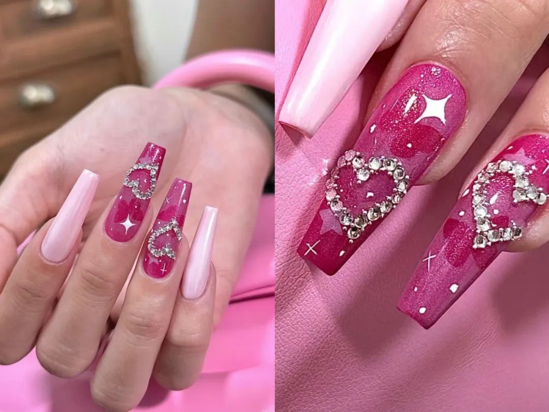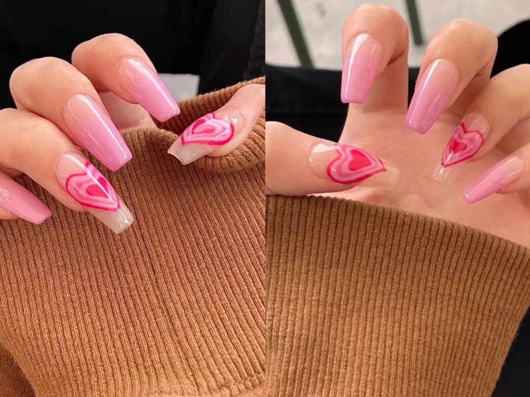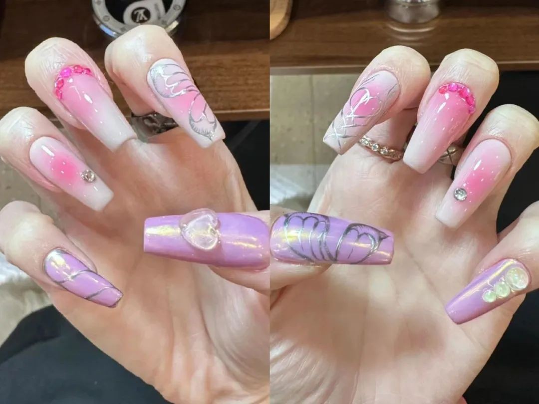 玫粉色爱心超级辣妹,又甜又嫩显白一绝,双拼法式高级感里增加一丝活泼,甜辣双修,漫画感多层爱心超可爱。