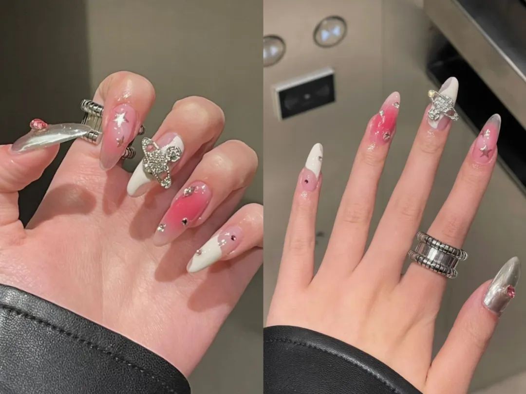 做完立马就到芭比世界参加派对,就是辣翻!喷枪做出的蝴蝶,浅粉色蹭珍珠粉,还有芒星,整体闪钻胶,小圆珠小钢珠粘出爱心形状,怎么看都好看,同款做jio甲也好看。