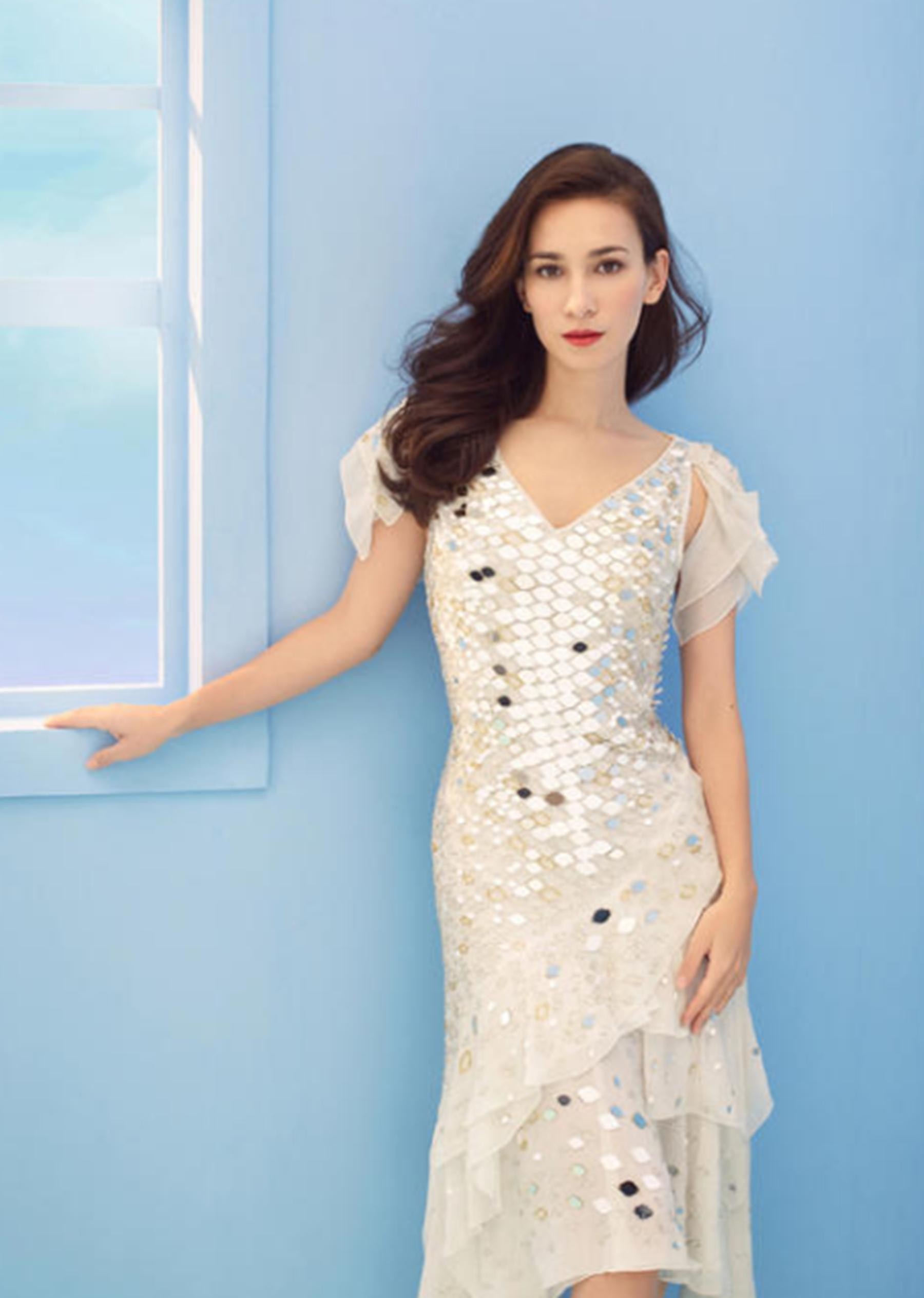 看看长发时候的卢靖姗,多么漂亮,一言一行都在散发魅力。这条裙子将身材的曲线都给展示出来,小V领的设计很是大方,将锁骨给展示出来,肩膀的地方也做了修饰,这种纱纱的叠加非常漂亮,很梦幻。衣服上还有菱形亮片,就像是真人版的美人鱼。