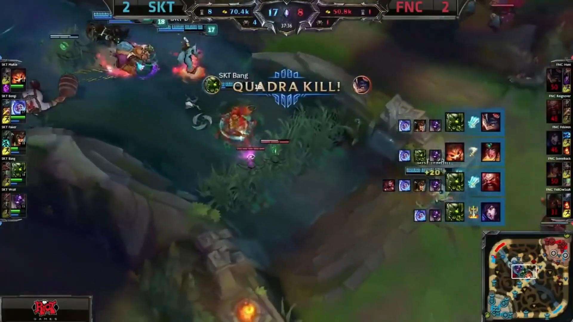 2015 MSI季中邀请赛半决赛SKT和FNC再次进行交手,前四场比赛双方打得有来有回杀进决胜局,决胜局Bang选出了老版本的厄加特,当时Bang厄加特以一波四杀团灭FNC,带领SKT成功杀进MSI决赛!