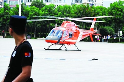 21日中午,直升机降落在武汉首义广场上 长江日报记者李子云 摄