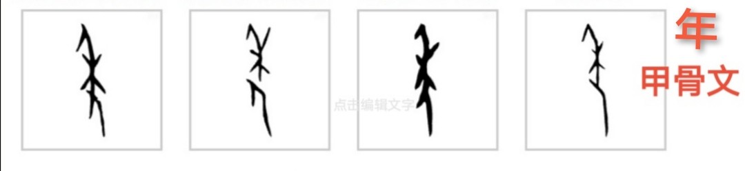 年字的甲骨文上面是代表庄稼的禾字,下面是一个人,表示一个人正在满载收获而归,本意是“收成”。甲骨卜辞中常见“受黍年”“受稻年”的文字。金文的年字基本维持了甲骨文的原型。