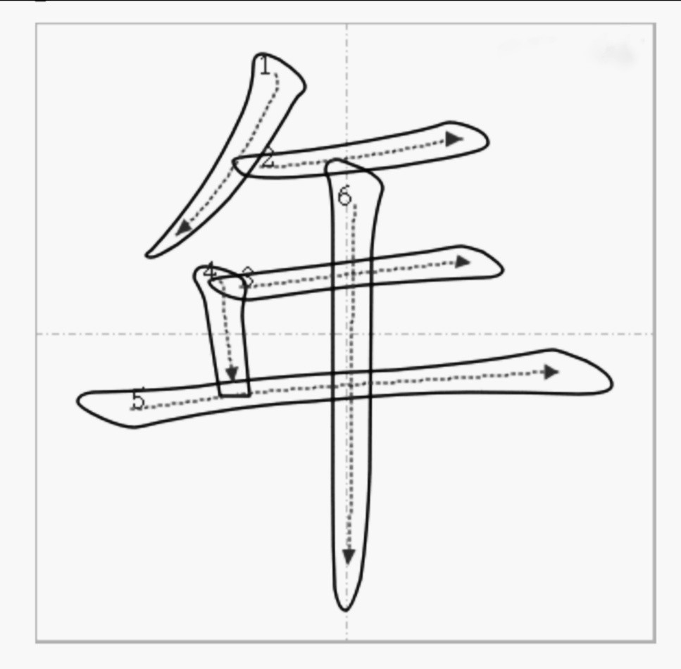 书写时下面一横最长,位置在田字格中线之下。书法书写时也有写成第二横最长,最下一横在中线位置附近的(参见上图)。
