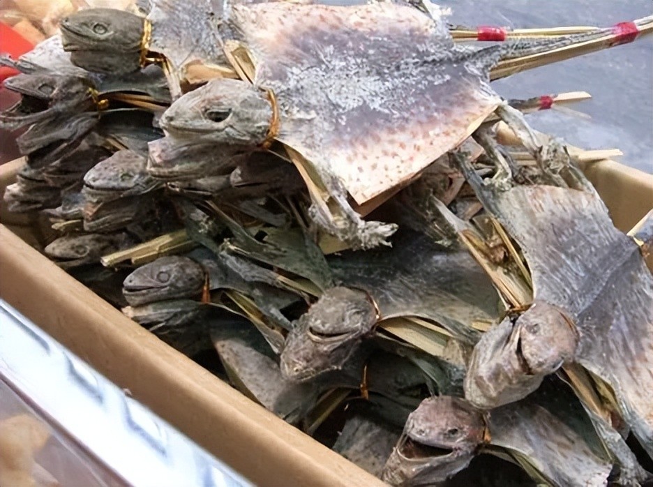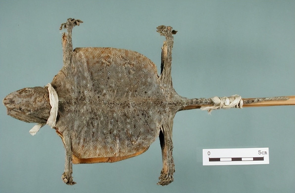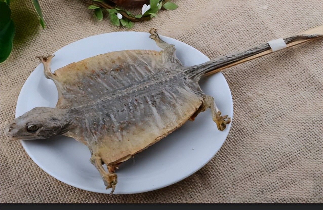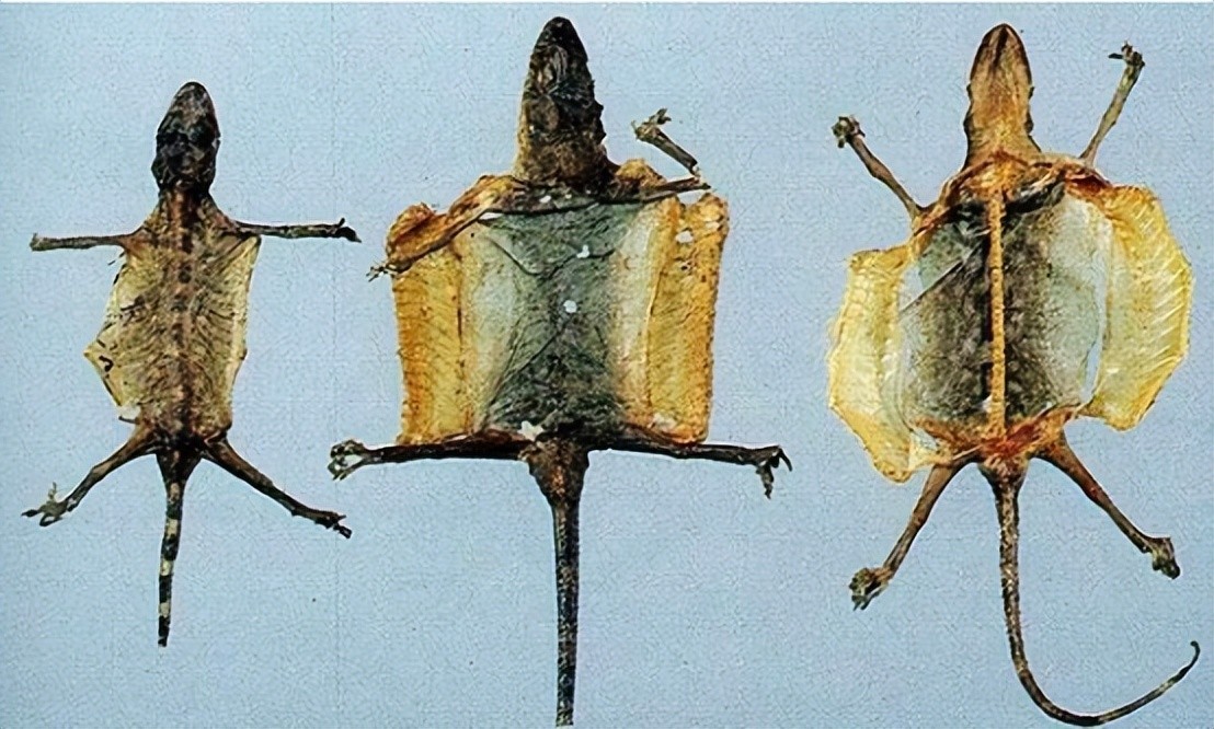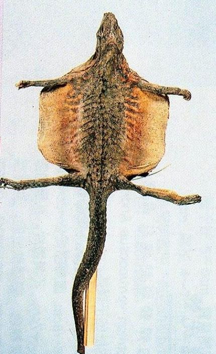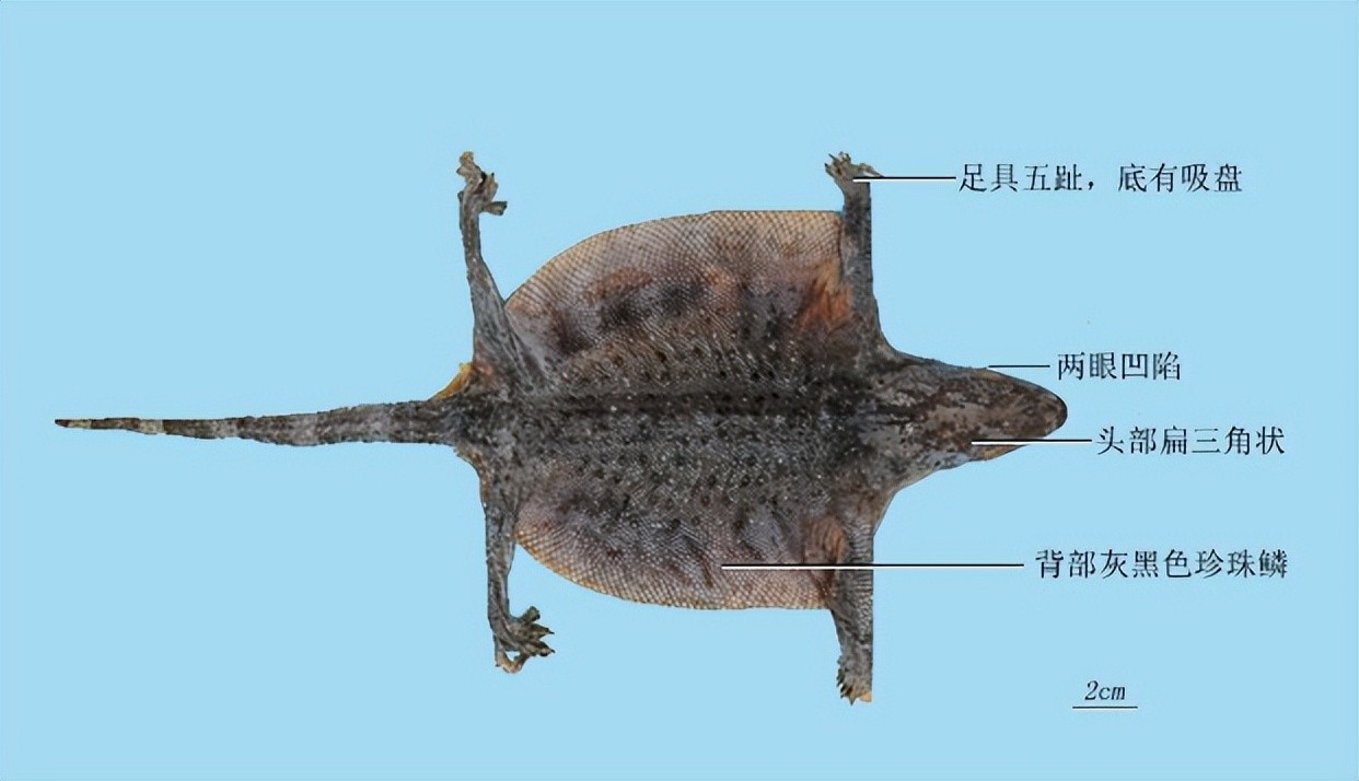 【性状】 本品呈扁片状,头颈部及躯干部长9~18cm,头颈部约占三分之一,腹背部宽6~11cm,尾长6~12cm。头略呈扁三角状,两眼多凹陷成窟窿,口内有细齿,生于颚的边缘,无异型大齿。吻部半圆形,吻鳞不切鼻孔,与鼻鳞相连,上鼻鳞左右各1片,上唇鳞12~14对,下唇鳞(包括颏鳞)21片。腹背部呈椭圆形,腹薄。背部呈灰黑色或银灰色,有黄白色、灰绿色或橙红色斑点散在或密集成不显著的斑纹,脊椎骨和两侧肋骨突起。四足均具5趾;趾间仅具蹼迹,足趾底有吸盘。尾细而坚实,微现骨节,与背部颜色相同,有6~7个明显的银灰色环带,有的再生尾较原生尾短,且银灰色环带不明显。全身密被圆形或多角形微有光泽的细鳞。气腥,味微咸。