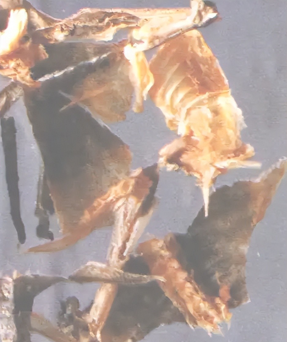 【性状】 本品呈不规则的片状小块。表面灰黑色或银灰色,有棕黄色的斑点及鳞甲脱落的痕迹。切面黄白色或灰黄色。脊椎骨和肋骨突起。气腥,味微咸。