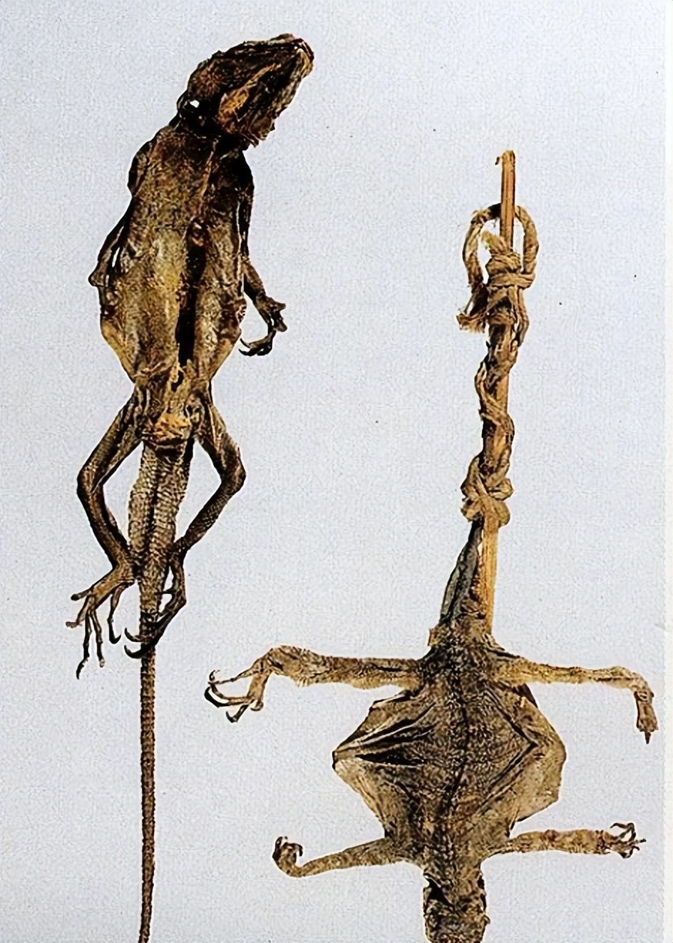 蜡皮蜥:为鬣蜥科动物蜡皮蜥除去内脏的干燥体,俗称红点蛤蚧。全长约40cm,尾长近体长两倍。上唇具2个大齿,有眼睑,鳞片细小,无疣鳞。体背灰黑色,密被橘红色圆形斑点,体两侧有条形横向的橘红色斑纹。指趾狭长而细,均具锐利爪。生活时尾不易断。