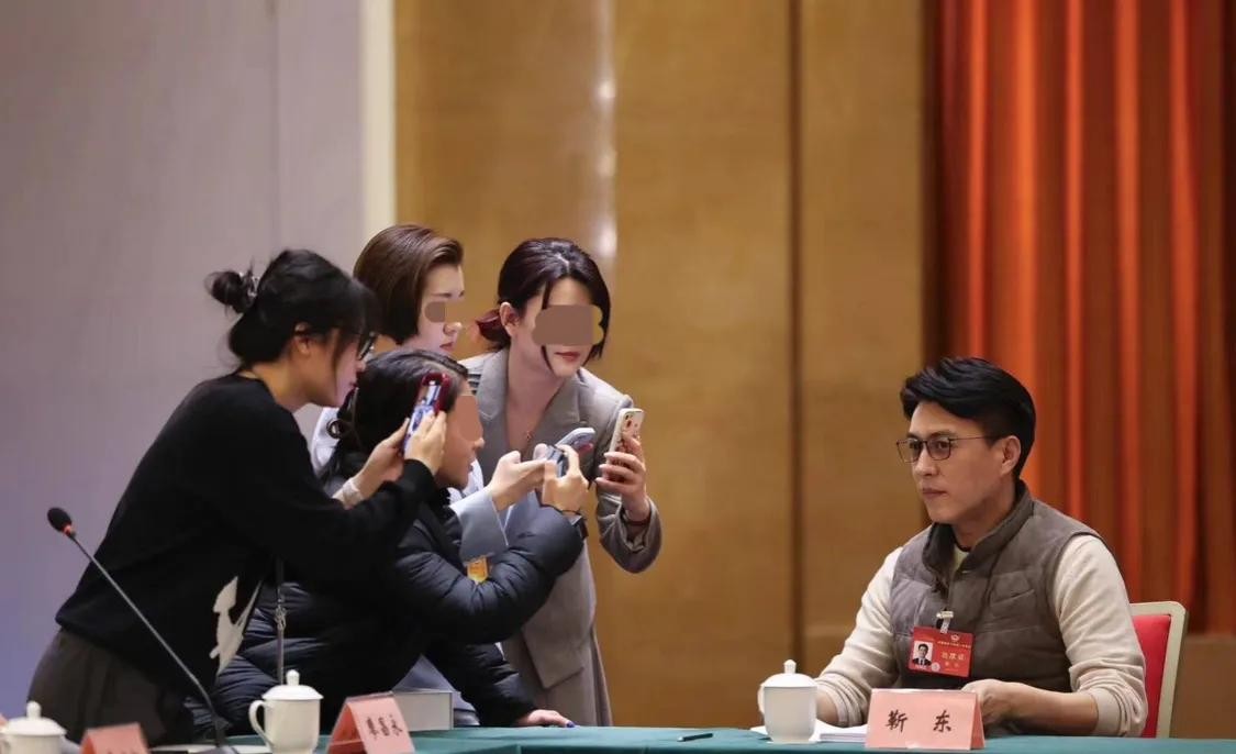 靳东的人气不是一般的高,在开放日这天,坐在座位上的靳东被一群女记者围着拍照。